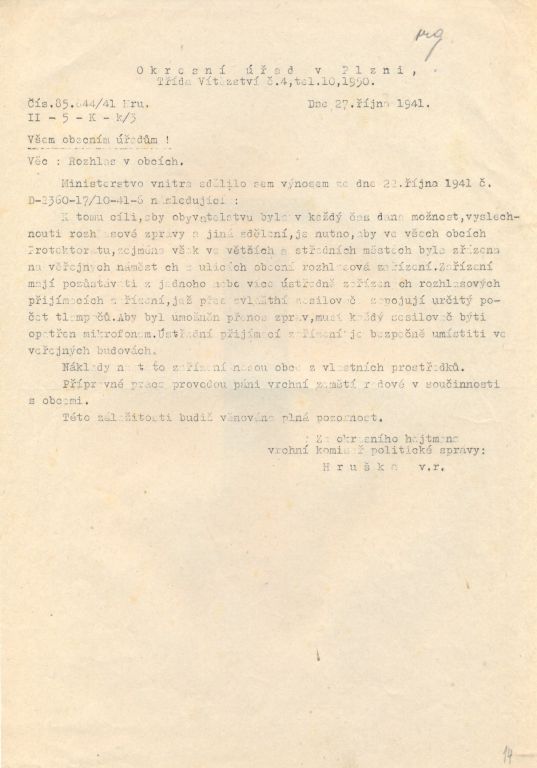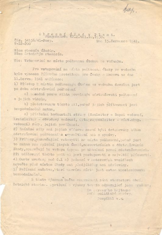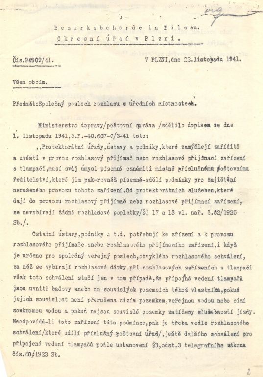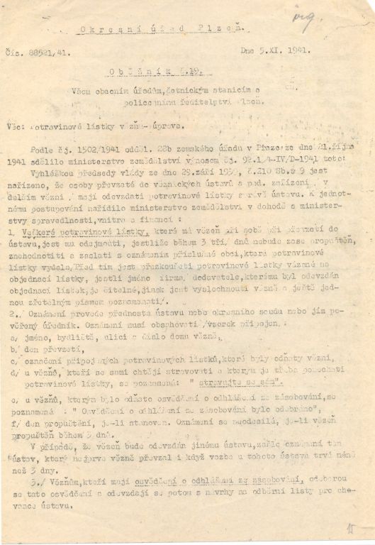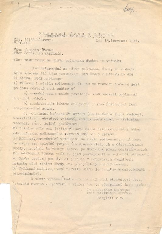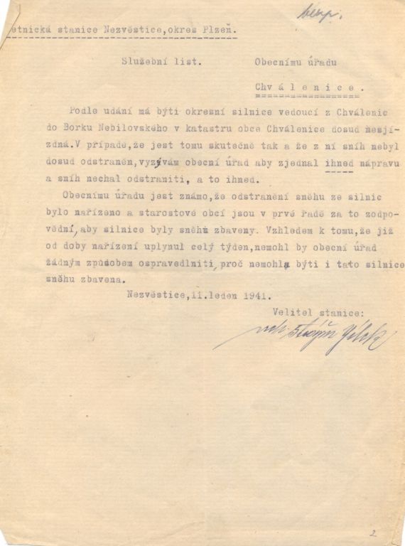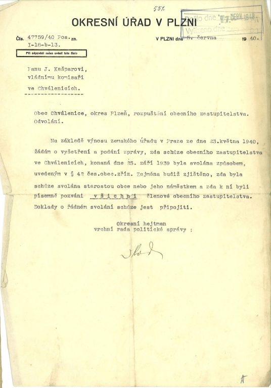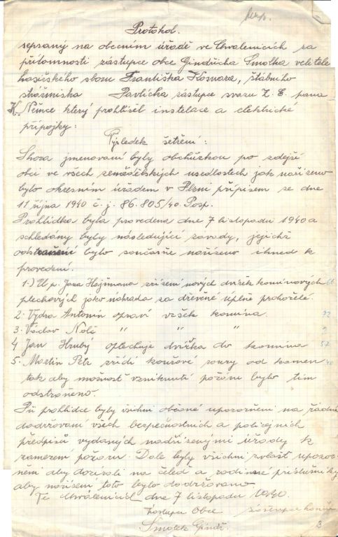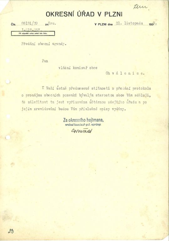 Většina dokumentů v této složce pochází z doby okupace a dokazuje. Některá všeobecná vládní nařízení nám dnes dokládají, v jak komplikovaných podmínkách tehdy úředníci museli pracovat. Jiné dokumenty ale dokazují snahu obce řešit každodenní problémy. Mezi ukázkami nechybí ani záležitosti týkající se tvorby obecního rozpočtu. Zajímavostí mezi dokumenty je korespondence ohledně nepříjemné komplikace z druhé poloviny roku 1939. Tehdy došlo v obecním zastupitelstvu k nepřehlednému sporu, který na podzim vedl k rozpuštění obecního zastupitelstva a ustanovení tzv. vládního komisaře jak s pravomocemi starostmi tak s pravomocemi zastupitelstva. Mimochodem, v podobné situaci se ve stejné době nacházelo i město Plzeň. Vládní komisaři spravovali svými nařízeními obec až do roku 1945.